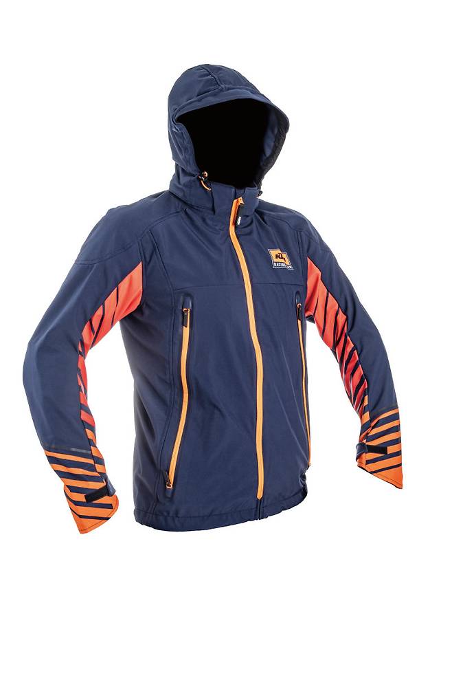 어깨와 팔꿈치에 보호대가 포함된 방수 기능을 갖춘 KTM 소프트 쉘 라이딩 재킷. 후면에 음각으로 새겨진 KTM 로고가 포인트가 된다. 안감은 메시로 구성하여 통기성을 높였다. 후드는 탈부착할 수 있고 안쪽의 포켓은 방수 처리되어 전자기기를 보관하기 편리하다.