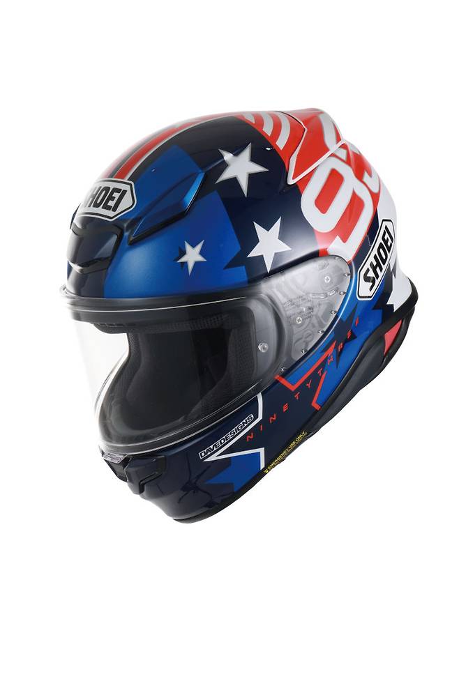 모토 GP의 리빙 레전드 마크 마르케즈의 재킨 넘버 93이 눈에 띄는 새로운 데칼이 적용된 쇼에이의 Z-8 시리즈. 성조기의 레드&블루, 스타 패턴이 눈에 띄는 아메리칸 스피릿 데칼과 그레이&레드의 색조합으로 튀지 않으면서도 포인트를 줄 수 있는 것이 특징인 트랙 데칼이 출시되었다. Z-8은 쇼에이의 스포츠 풀페이스 헬멧으로 헬멧 사이즈에 비해 작은 쉘 크기로 많은 라이더의 선택을 받고 있는 헬멧이다. 기존에도 조용하고 편안한 헬멧으로 알려진 쇼에이 헬멧이지만 전작인 Z-7에서 8로 진화하면서 풍절음을 줄이고 공력 특성을 보강했다. 힌지 윤활을 위한 실리콘 오일과 각종 파츠, 그리고 전용 핀락까지 기본 구성에 포함되어 있다.