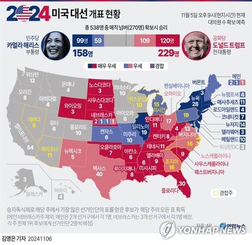 AP통신에 따르면 5일 오후 9시(현지시간) 기준으로 트럼프 전 대통령이 53.5%, 해리스 부통령이 45.4%를 득표했다.