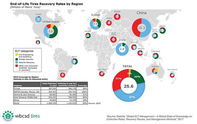그러면 타이어의 재활용이 현재 어떻게 이루어지고 있는지도 살펴봐야 할 것이다 . 브리지스톤의 본고장인 일본을 기준으로 하면 , 다 쓴 타이어의 회수율 자체는 약 94%로 높은 편이다 . 그러나 시멘트 공장 또는 발전소 등을 통해 다 쓴 타이어를 태워서 열에너지를 얻는 ‘서멀 리커버리 ’가 약 70% 도를 차지한다 . 아스팔트 또는 다른 고무 제품으로 재활용하는 ‘머테리얼 리사이클 ’은 20%정도밖에 되지 않는다 .