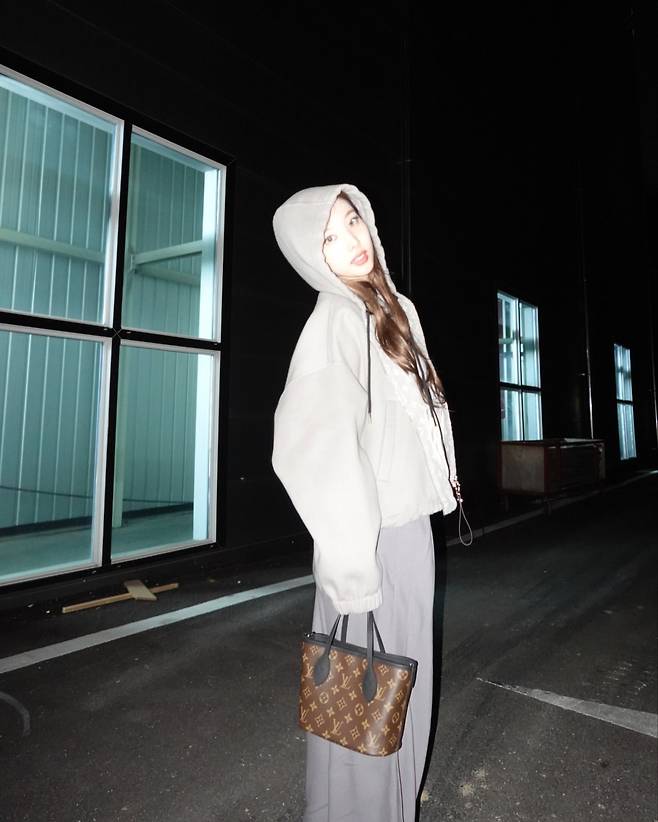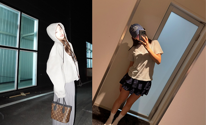 두 번째 사진에서는 오버핏 후드티와 와이드 팬츠를 활용해 여유로운 실루엣을 선보였다. 여기에 루이비통 토트백을 더해 고급스러움을 가미하며, 심플한 스트리트 패션에 세련된 포인트를 준 것이 돋보인다.