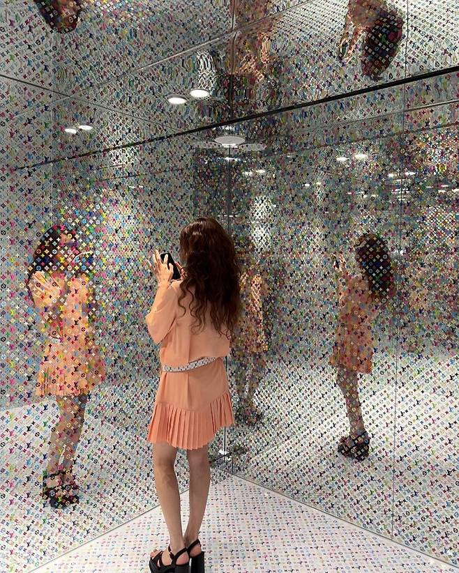 사진 속 나연은 주황빛 플리츠 디테일의 미니 드레스를 착용해 화사하고 여성스러운 매력을 발산했다. 플랫폼 샌들을 매치해 다리를 더욱 길어 보이게 하며, 배경의 거울과 어우러져 독특한 분위기를 연출했다.