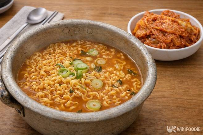 오래 묵혀 새콤한 맛이 강한 '묵은지'는 구수한 된장 향이 감도는 라면과 잘 어울린다. 된장을 기반으로 한 국물은 묵은지의 톡 쏘는 신맛을 부드럽게 감싸주며 입안 가득 감칠맛을 높여준다. 자칫 짜게 느껴질 수 있는 된장 베이스의 국물에 잘 익은 김치의 산미가 더해지면 맛의 균형이 완벽하게 잡히기 때문이다.