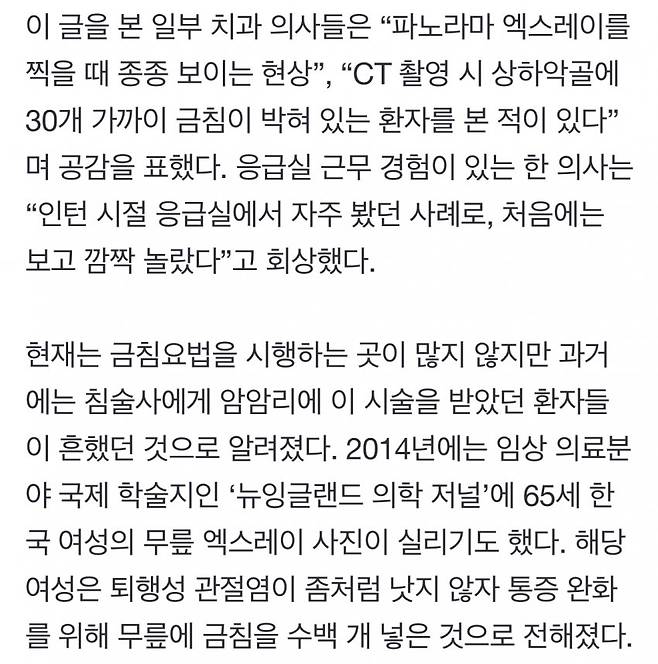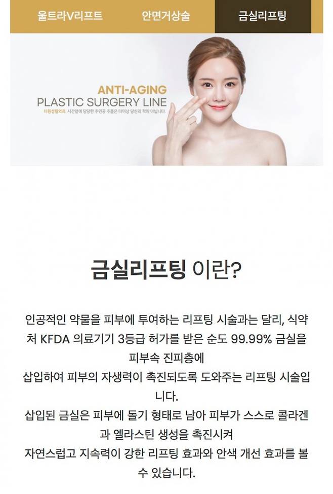 예전에는 무자격자 침술사들이 금침요법이라고 몰래 몰래 하던걸 요즘은 산부인과나 성형외과에서 금실 리프팅이란 이름으로 미용목적으로 한디고 ㅋㅋㅋ