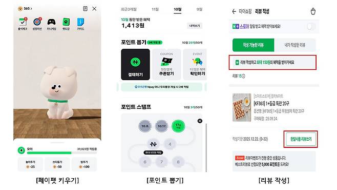 - 클릭 미션, 포인트 뽑기, 페이펫 키우기, 구매 적립, 리뷰 작성 등