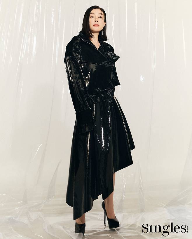 유광 소재의 아우터와 스커트를