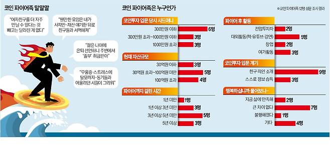 코인 파이어족들은 행복할까. 예상과는 다른 답이 대다수에게서 돌아왔다. 한모씨는 “‘경제적 자유’가 행복을 보장하는 것은 아니더라”고 말했다. 곽모씨는 “버킷 리스트를 만들어 다 해봤는데, 3년쯤 되니까 더 이상 할 게 없더라”며 “우울증 때문에 고생했는데, 그때마다 돈이 없어 친구들과 스크린골프 치던 때가 자주 생각났다”고 했다. 설문 결과 “삶이 크게 달라지지 않았다”거나 “돈이 행복과는 상관없더라” 등 특별한 변화가 없다고 답한 경우(8명)가 3분의 2에 달했다.