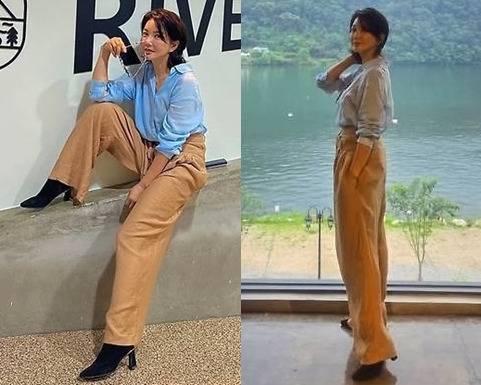 하늘색 셔츠에 카멜톤 와이드 팬츠를 매치해 내추럴하면서도 세련된 컬러 밸런스를 연출했습니다.