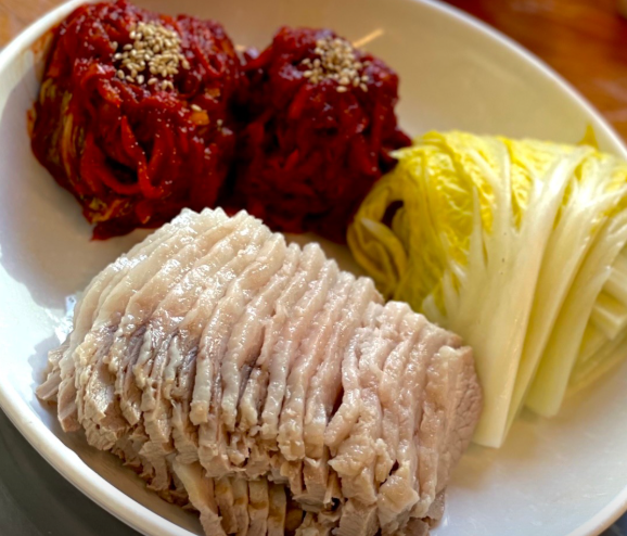▶ 곁들임: 달콤한 무절임, 김치, 배추보쌈 속이 어우러져 풍성한 맛
