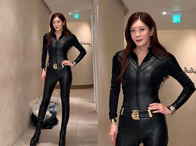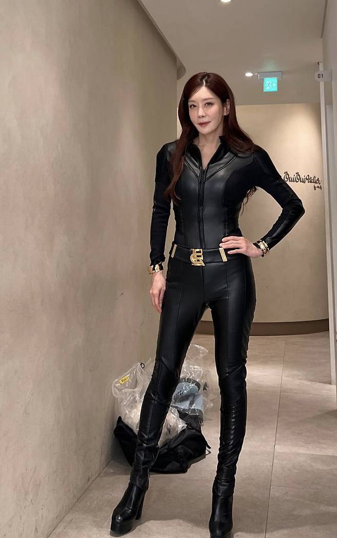블랙 레더 점프수트를 완벽히 소화하며, 마치 영화 속 히어로 같은 강렬한 카리스마를 보여줬다. 몸을 타이트하게 감싸는 실루엣은 그녀의 균형 잡힌 체형을 드러내며 압도적인 분위기를 자아냈다.