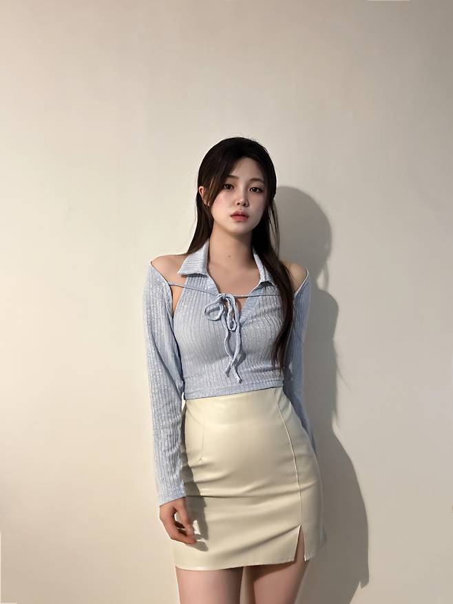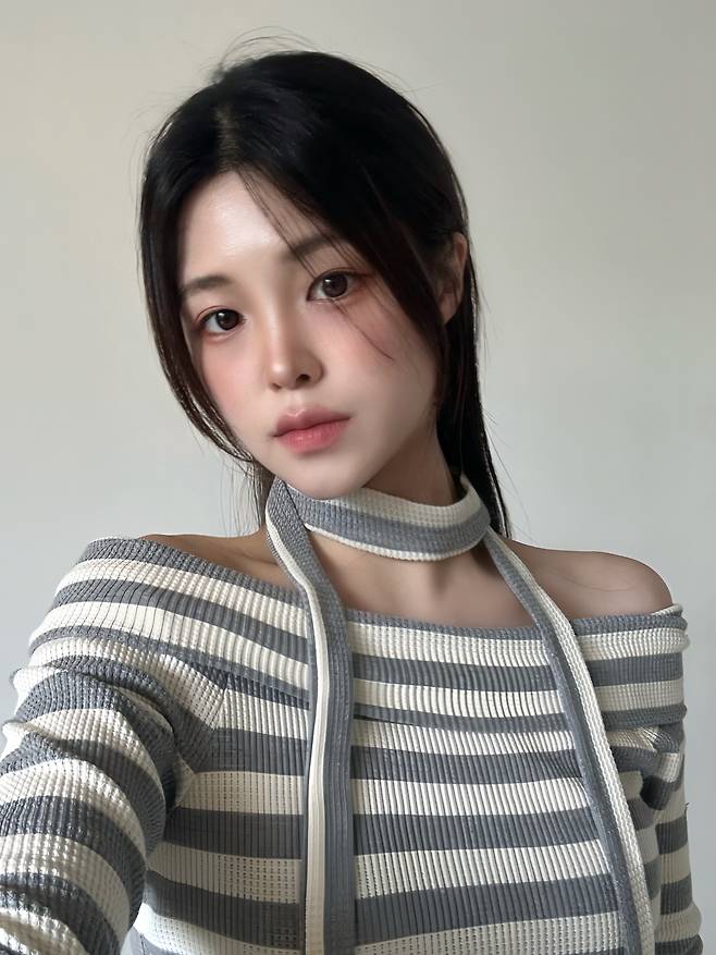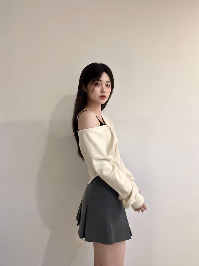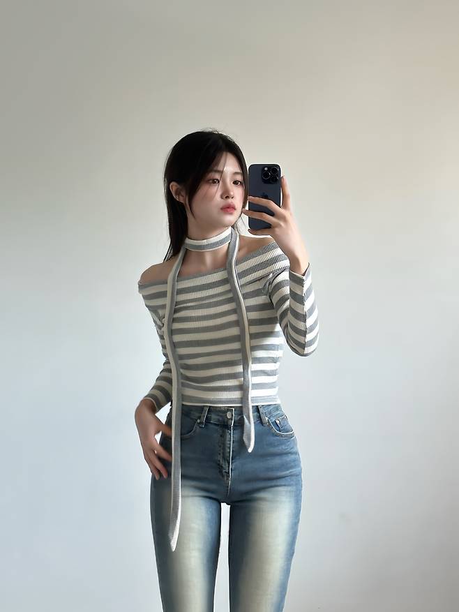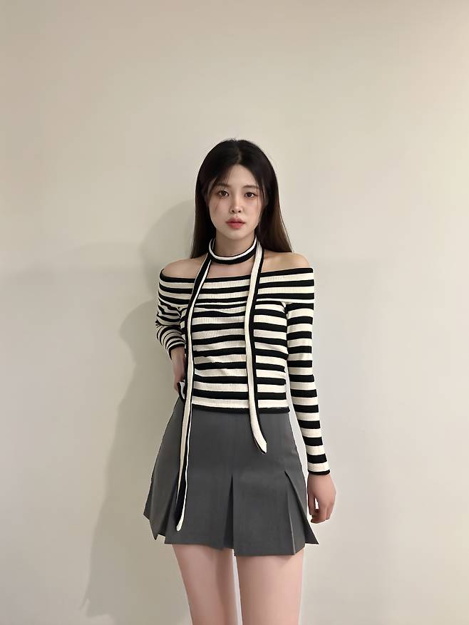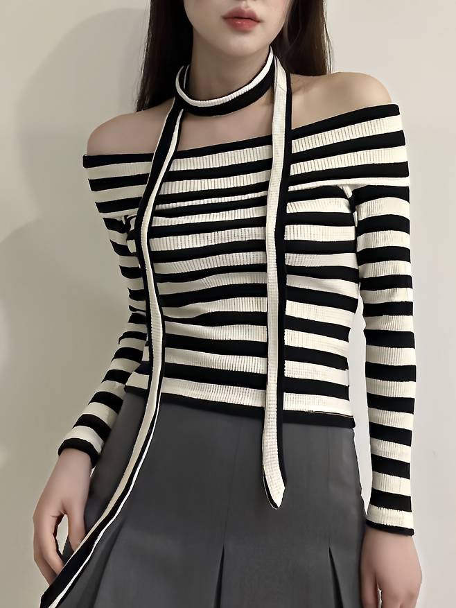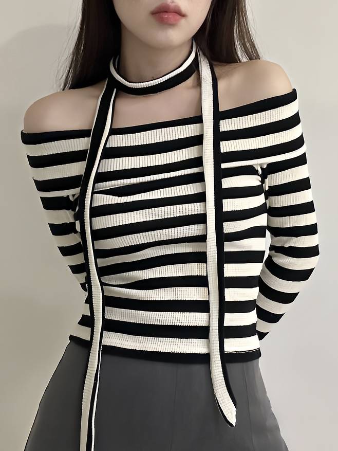 이렇게 오프숄더로 입으면 여리여리한 분위기를 연출할 수 있어요