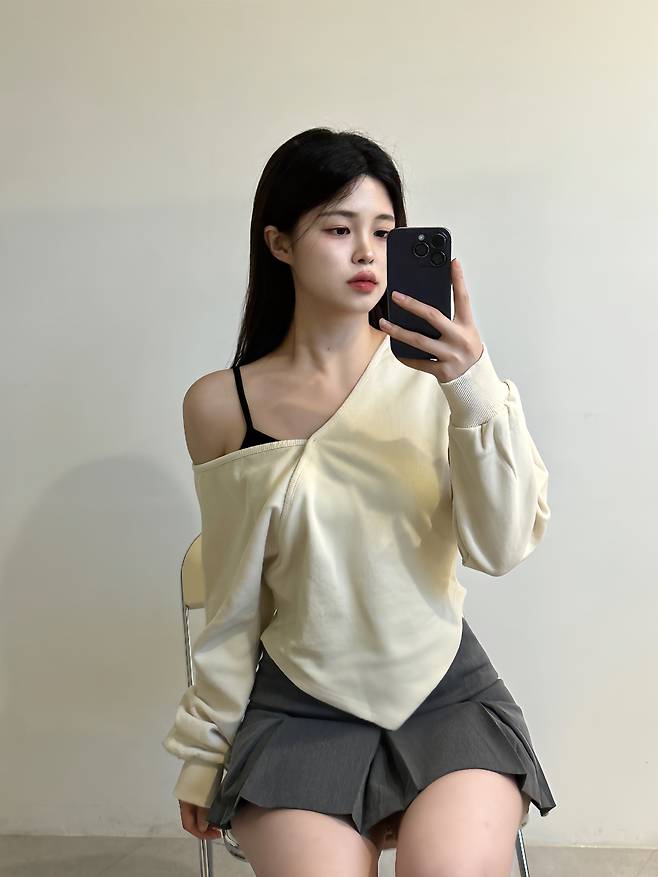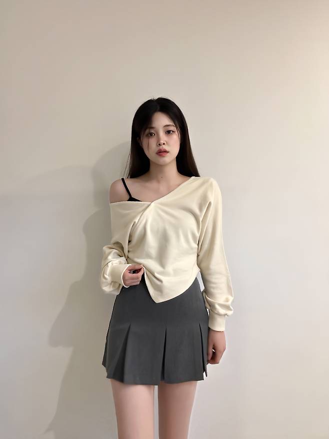 오프숄더로 어깨라인을 드러내서 입을 수 있는 맨투맨이에요:)