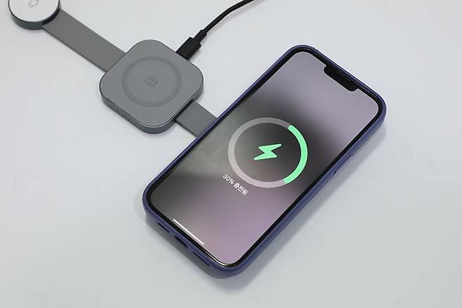 스마트워치 충전패드에는 자석이 내장되어 있어서 스마트워치를 가까이 대면 자동으로 붙으면서 충전이 시작되며, 스마트폰 충전패드 역시 맥세이프 기능을 지원해서 아이폰을 올려두면 자동으로 충전 위치에 부착되면서 충전이 진행된다.