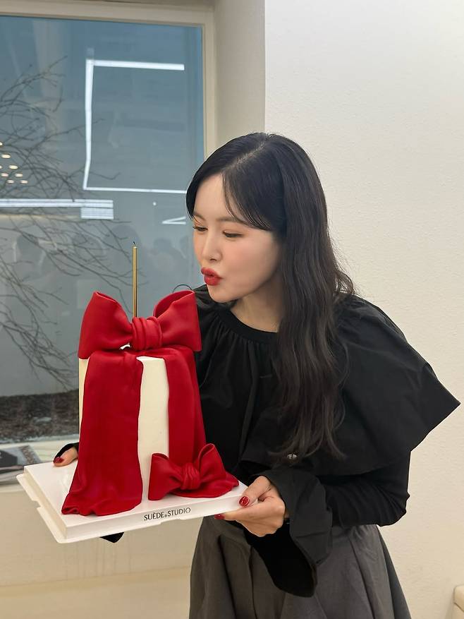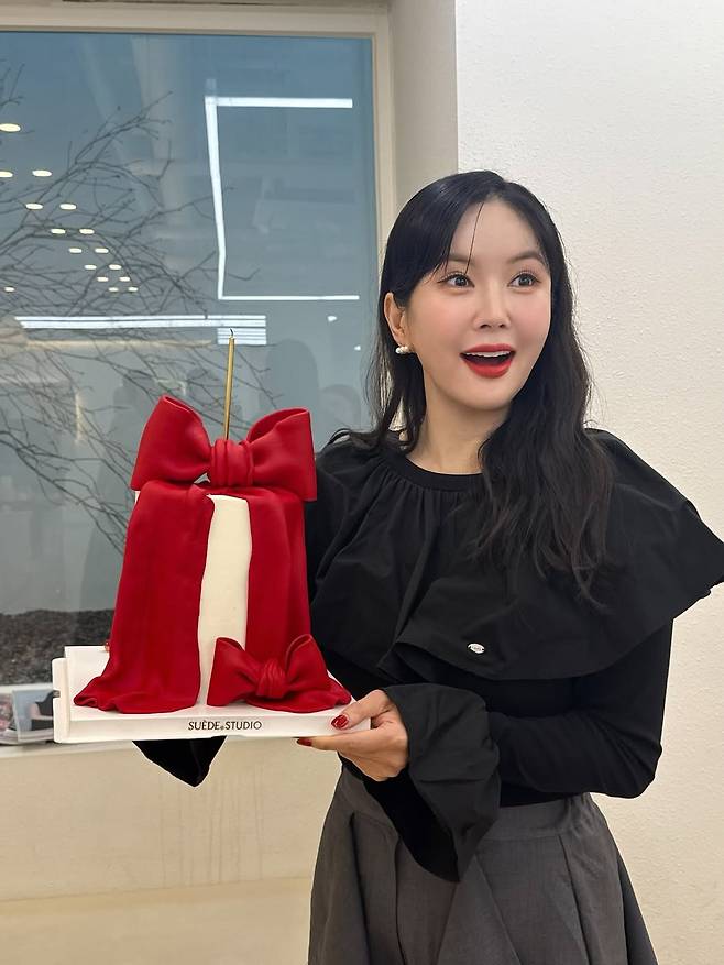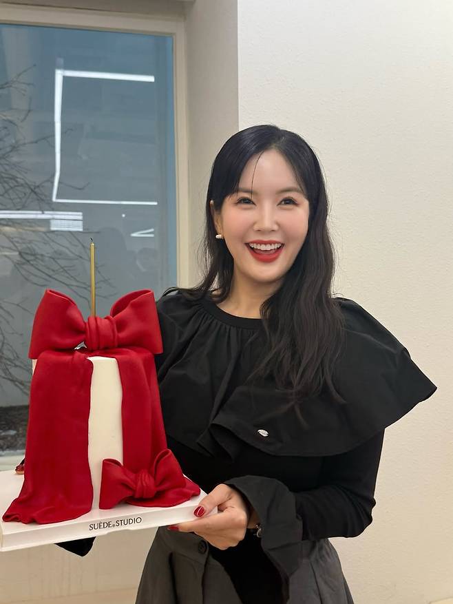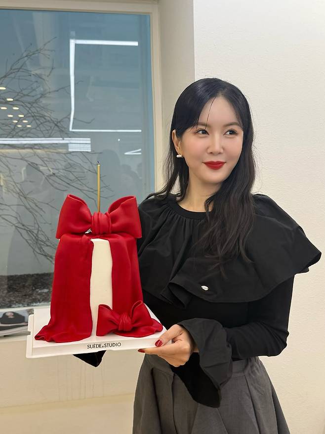 붉은 리본 장식 케이크를 들고 있는 순간, 그녀의 표정에는 진심 어린 기쁨이 묻어났다.