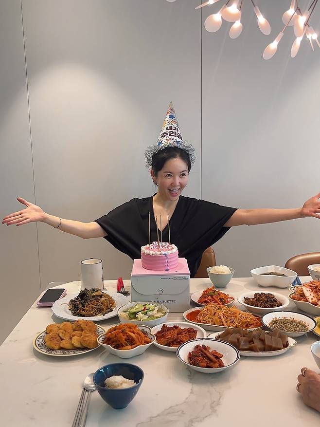 따뜻한 조명이 비춘 테이블 위, 장영란은 환한 미소와 함께 두 팔을 활짝 벌렸다.