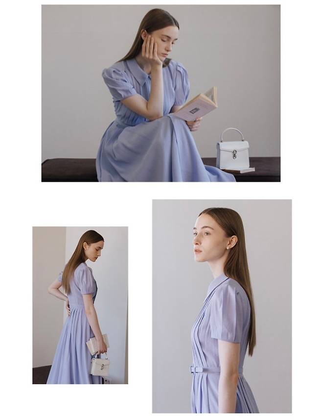LILITH Stand collar pin tucked long dress (Cornflower blue)