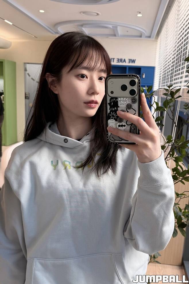 또 눈에 띈 건 후드티였다. 색이 워낙 예뻐서 잠깐 탐이 났다(?). 하늘색 계열이었는데 신이슬에게 유독 잘 붙었다. 신한은행을 떠올리게 하는 색이라 더 잘 어울렸는지도 모르겠다. 후드티가 제 주인을 만난 느낌이었다.
