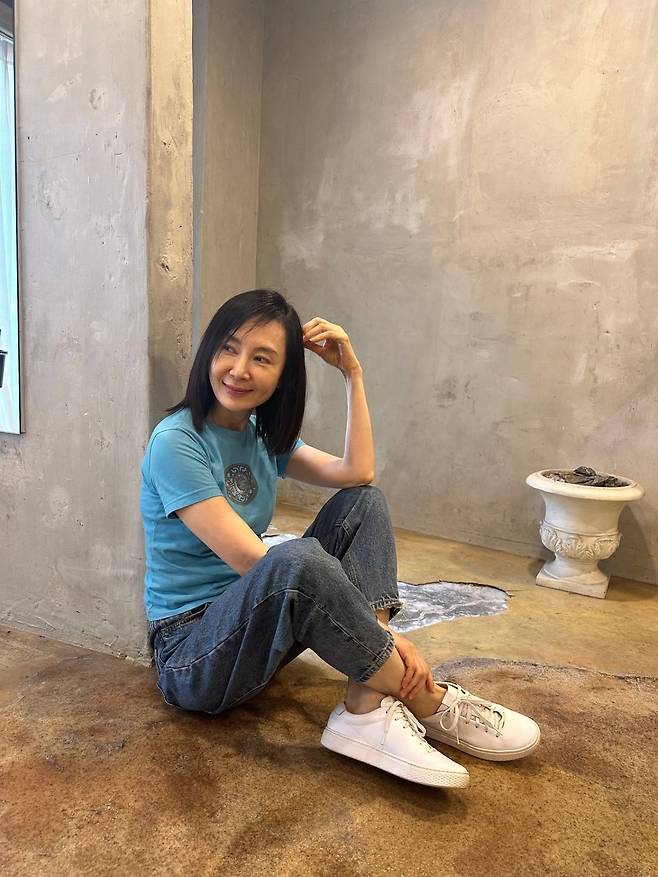 채시라가 공개한 이번 스타일은 군더더기 없는 심플함 속에 자연스러운 멋을 담고 있다. 콘크리트 질감의 내추럴한 공간을 배경으로 파란색 티셔츠와 루즈핏 데님 팬츠를 매치하며, 앉아 있는 포즈에서조차 여유로운 분위기를 풍겼다. 화사한 블루 톤 상의는 피부 톤을 환하게 밝혀주며, 중앙의 작은 그래픽이 포인트가 된다. 여기에 약간 여유 있는 실루엣의 데님 팬츠는 활동성을 강조하고, 접어 올린 밑단으로 경쾌한 리듬감을 더했다.