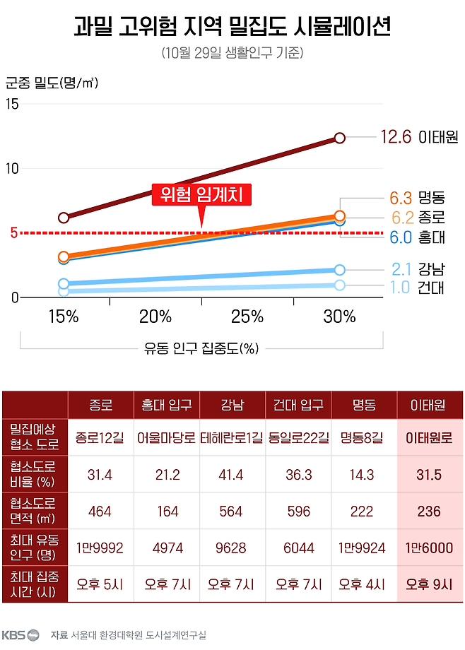 사고의 결정 요인은 유동 인구가 특정 장소와 시간에 얼마나 집중되었느냐였습니다. 이태원 사고 장면을 분석한 전문가들은 당시 사고 도로에 제곱미터당 10명 이상이 밀집했다고 보고 있습니다. 연구팀은 10월 29일 이태원에서 유동 인구가 가장 많았던 저녁 9시에는 1만 6천 명이 사고 도로 주변 2~300미터 이내에 있었다고 분석했습니다. 사고 장소의 면적을 고려하면 유동 인구의 25%가 협소 도로에 밀집한 겁니다.