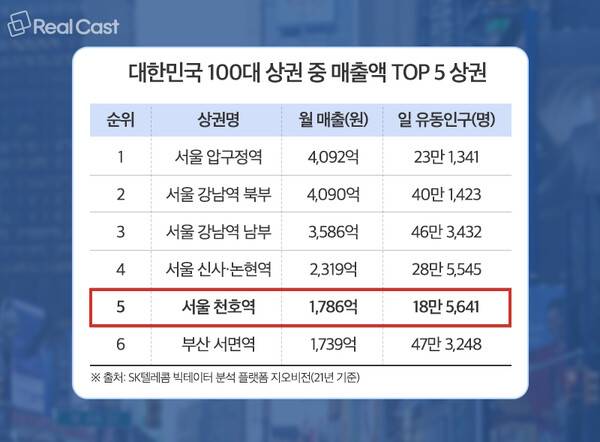 5위는 서울 동부권역 대표 상권으로 꼽히는 천호역 상권이 이름을 올렸습니다. 천호역 상권 다음으로는 부산 서면역 상권이 뒤따르고 있습니다.
