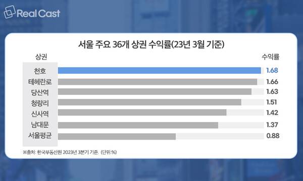 당시 천호 상권의 수익률은 1.68%을 기록해 서울지역 평균 수익률(0.88%) 보다 약 2배 가량 높은 것으로 나타났습니다. 천호 상권에 차순위는 테헤란로, 당산역, 청량리, 신사역 상권 등이 이름을 올렸습니다.