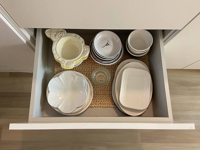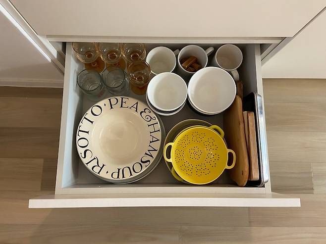 두 번째와 세 번째 서랍에는 그릇들을 수납해서 사용하고 있답니다. 아직 2인 가구라 그릇이 많이 필요하지 않아서 이정도 수납공간에도 부족함 없이 사용하고 있어요.