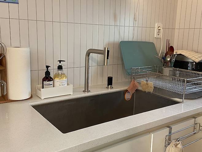 덕분에 싱크대 물받이에 물때 낄 걱정 없고 시원시원하게 설거지를 하고 있어요. 수전은 ㄱ자 수전인 슈티에 수전이에요. 현재까지도 만족하고 있는 디자인입니다. 저희 집은 대부분이 둥그런 아치형 디자인인데 유일하게 주방에만 각진 디자인이 많네요^^
