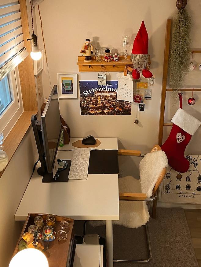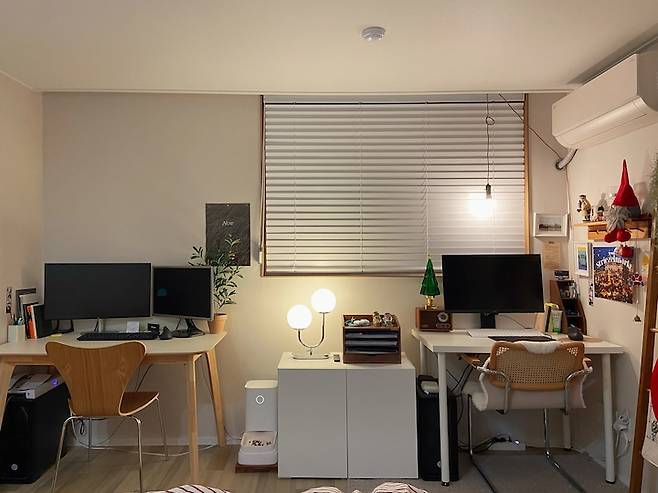 바로 옆에는 남편이 업무를 보는 책상이에요. 제 책상과는 상반된 깔끔하고 정돈된 느낌이지요ㅎ 남편은 듀얼모니터로 넓게 업무를 봐야 한다고 해서 제 책상보다는 조금 더 큰 책상을 두었어요.