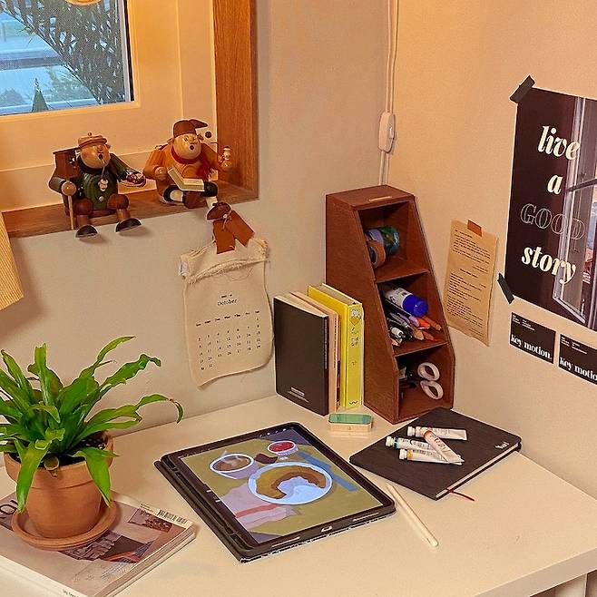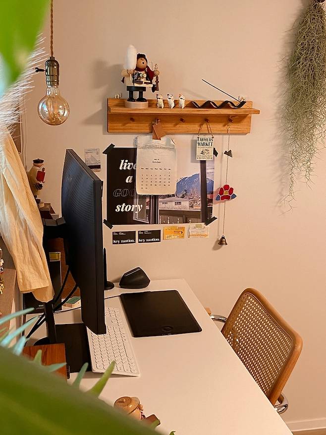 여기는 제가 일하는 책상이에요. 늦은 밤까지 일할 때를 대비해서 천장에 팬던트 조명을 달아주고 아기자기하게 꾸미는 걸 좋아해서 주변에 소품들을 많이 두었어요. 특히 사다리 행거에 여러가지를 달아줄 수 있는데 패브릭을 걸어서 더 따뜻한 분위기를 연출했어요.