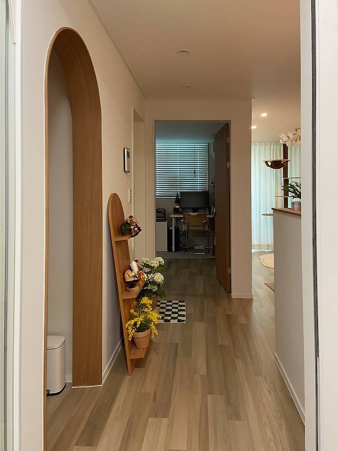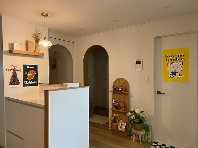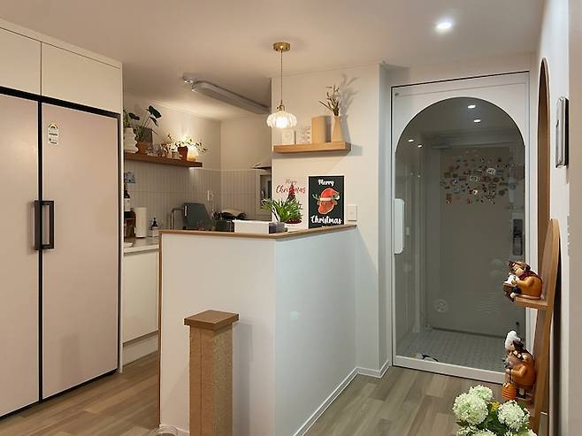 중문을 열고 들어오면 보이는 집 첫인상이에요. 오른쪽에 살짝 가벽을 세워서 짧은 복도처럼 보여지도록 했어요.