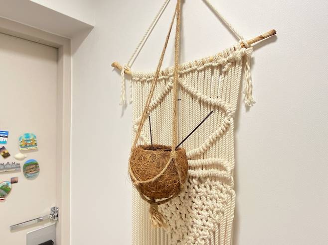 직접 만든 마크라메로 두꺼비집을 가리고 그 위로 인센스를 꽂아주었어요. 저희 집은 반려묘 달래와 함께 사는 집이라 인센스를 잘 피우지 못하는데요. 그래서 이렇게 현관에 인센스를 몇 개 걸어만 두었어요. 피우지 않고 두기만 해도 인센스 향이 은은하게 퍼져서 부담스럽지 않게 향테리어를 할 수 있어요.