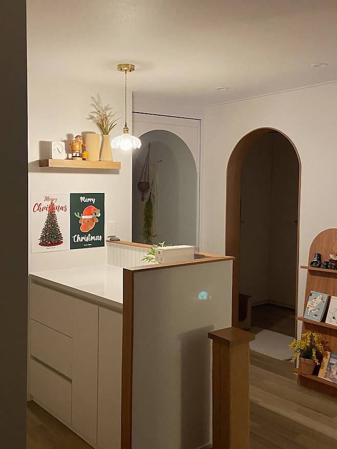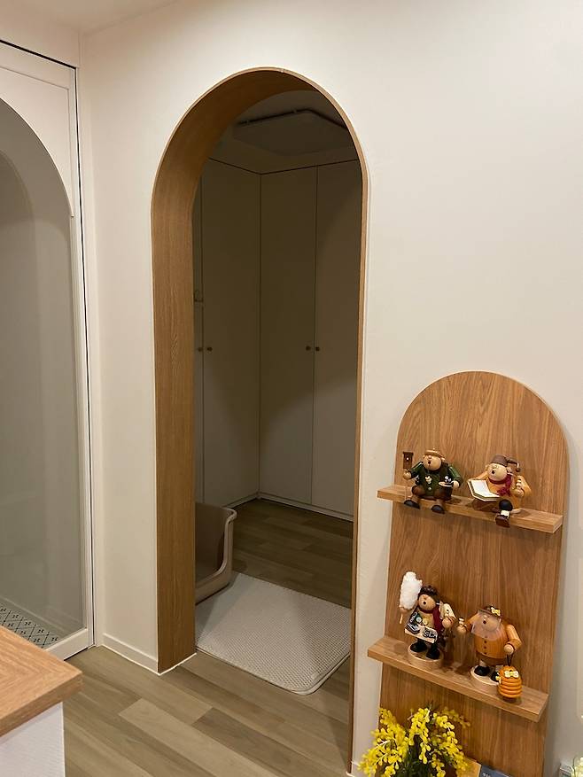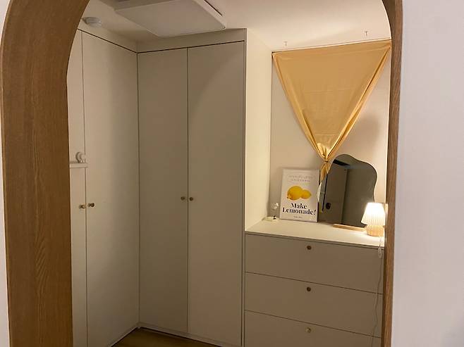 작은 방이지만 더 넓게 사용하고 싶어서 방문을 떼고 입구는 아치형으로 만들어주었어요. 방문을 없애니 문 뒷 공간까지 알뜰하게 사용할 수 있어요.