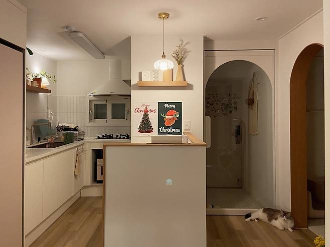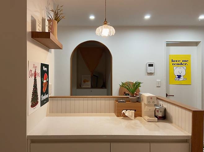 전체적인 집 레이아웃의 중심을 잡아주는 요소가 이 아일랜드형 조리대 같아요. 덕분에 현관에서 들어올 때 생긴 작은 복도도 맘에 들고요. 아일랜드형 조리대는 낮은 가벽을 세워서 우드 필름으로 마무리했어요. 가벽이 있어서 음식물이 튈 걱정이 없고, 현관과 주방의 경계가 명확해져서 좋아요. 아일랜드 위에는 포인트로 펜던트 조명을 하나 달아주었어요.