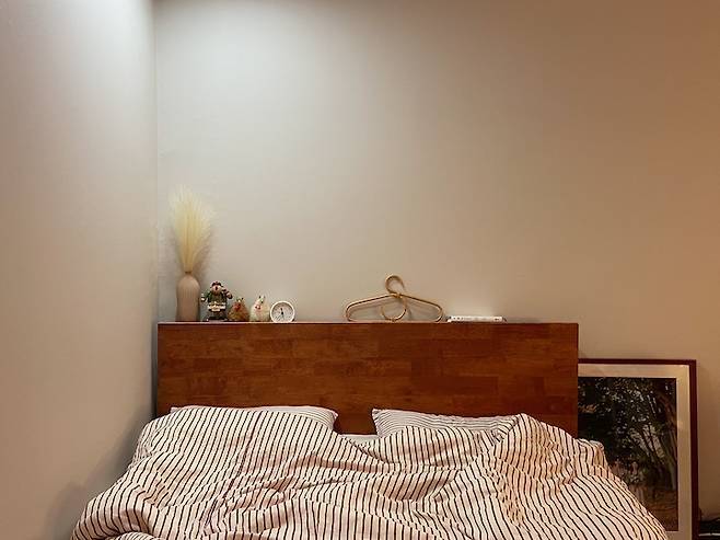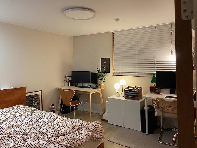 저녁에는 조명만 키고 지내는데 분위기가 너무 좋답니다. 쨍하지 않고 은은한 빛이 너무 좋아요. 책상 바로 뒤에 침대가 있어서 침대의 유혹에 빠지진 않을까 걱정했는데 생각보다 유혹에 잘 빠지진 않더라구요. 일어나자마자 침구정리를 해둔 덕분인 것 같아요.
