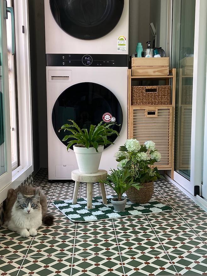 세탁기 옆에는 짜 맞춰서 넣은 것 같은 세탁바구니가 있어요. 한치의 오차도 없이 딱 맞게 들어가서 희열을 느꼈답니다ㅎ