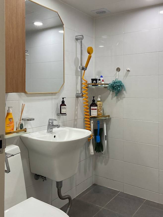 노란색 포인트 컬러가 한스푼 들어간 화장실이에요. 오래된 욕실 선반은 셀프로 바꿔주었어요. 포인트 컬러에 맞춰서 예쁜 선반으로 바꿔주고 싶었는데 타일 구멍에 맞는 선반을 찾기 어렵더라고요.