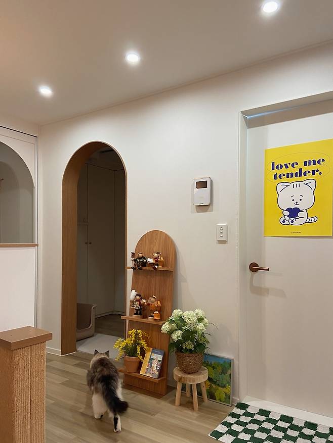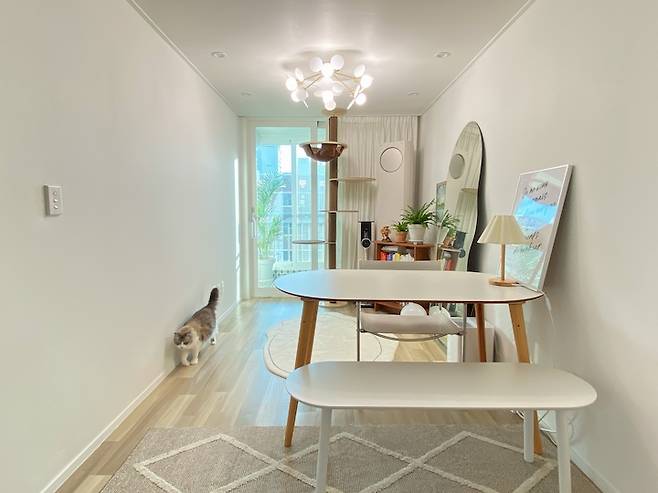 테이블에 앉아서 거실을 바라보면 달래를 위한 캣폴이 설치되어 있어요. 달래는 주로 캣폴 위에 올라가서 쉬거나 잠을 자는데요. 그 덕분에 낮에 업무 보다가 고개를 들면 달래가 자고 있는 모습을 보며 잠시나마 힐링을 할 수 있어요.