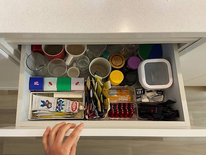 아일랜드의 첫 번째 서랍에는 자주 사용하는 컵들과 각종 영양제, 차 종류를 넣어놨어요. 가장 쉽게 손 닿을 수 있는 곳이에요.