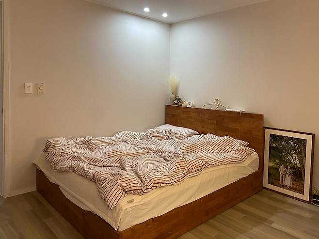 책상 반대편에는 킹사이즈의 침대가 있어요. 침대 프레임은 달래가 침대 바닥에 들어가지 못하도록 하단이 막혀있는 스타일로 선택했어요.