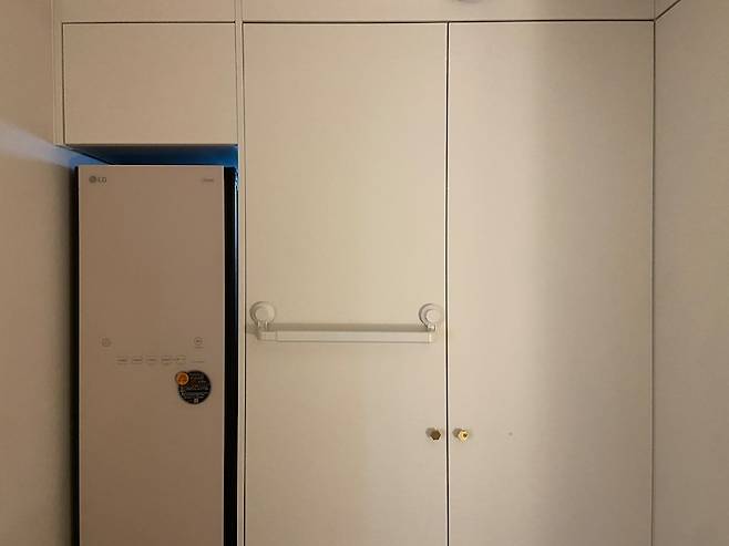 그리고 한쪽에는 스타일러가 들어갈 자리도 마련해 주었어요. 스타일러 위 쪽까지 수납을 만들어서 알뜰하게 사용중이에요. 그리고 붙박이장 바로 뒤에 창문이 있는데 어쩔 수 없기 통으로 가리게 되었어요. 덕분에 샷시(새시) 교체 공사를 하지 않아도 되어서 살짝 예산이 줄어들었답니다ㅎ