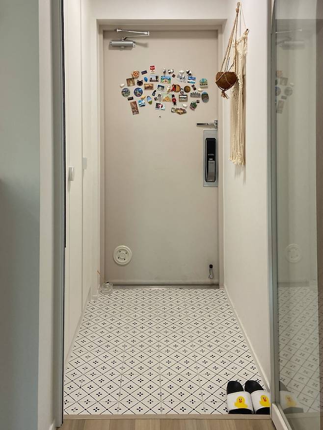 집에서 바라본 현관의 모습이에요. 여행지에서 만난 저희 답게 여행하다 모은 마그네틱들로 현관을 꾸며주었어요.