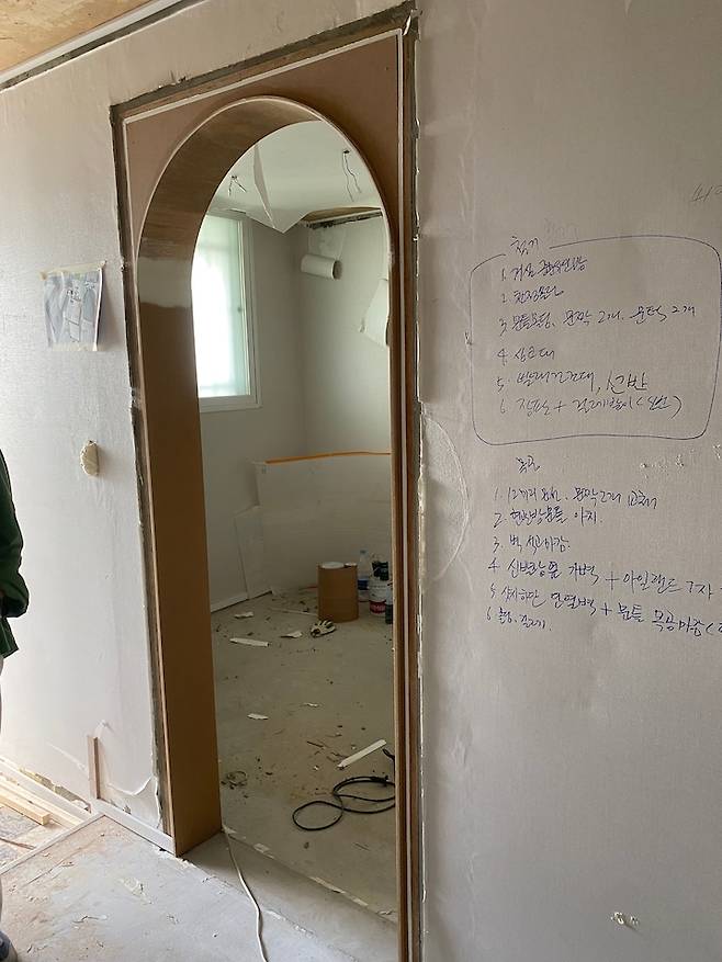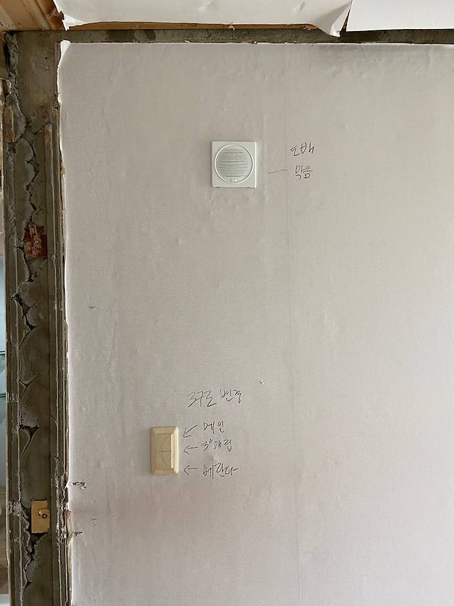 저희는 베란다가 있는 집을 원했기 때문에 베란다 확장공사는 하지 않았고 주방과 거실 사이에 남아있는 문틀과 천장을 터서 개방감을 주기로 했어요. 그리고 관리실 방송이 나오는 스피커는 도배로 막아 숨겨주기로 했어요.