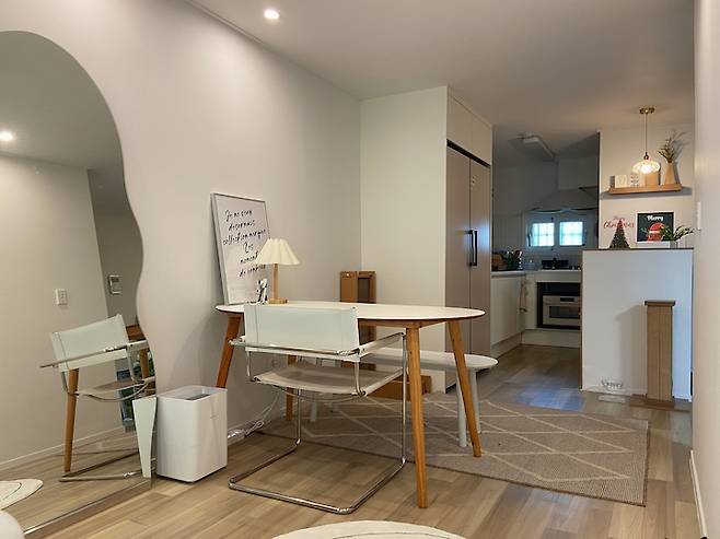 테이블 뒤 남은 공간에는 전신거울을 두었어요. 원래 현관에 두려고 산 전신거울인데 너무 예뻐서 거실로 위치를 옮겨주었어요. 좁은 공간이지만 전신거울 덕분에 조금 더 넓어진 효과를 보고 있어요.