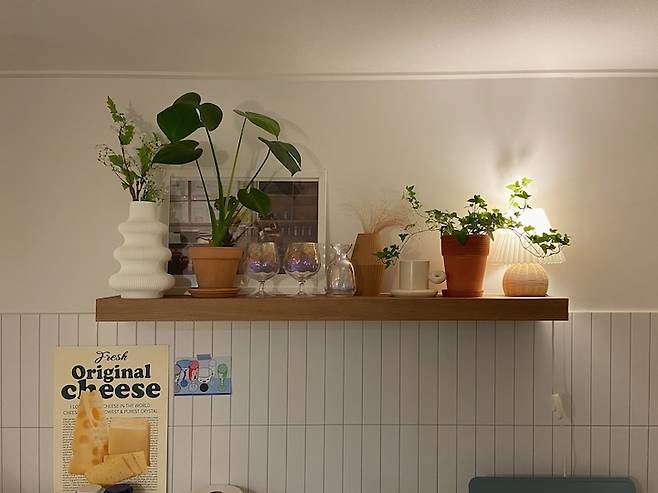 싱크대 위에는 답답한 느낌을 주는 상부장을 떼어내고 긴 우드 선반을 달아주었어요. 분위기에 따라, 또 날씨에 따라 올라가는 오브제들이 달라지는데 요즘은 이렇게 푸릇한 식물들이 올라가 있어요. 우드 선반도 마찬가지로 통일된 우드 필름으로 마감을 했답니다. 선반 위에 올라가는 오브제들은 가능하면 우드에 울리는 소품들로 올려주어요.