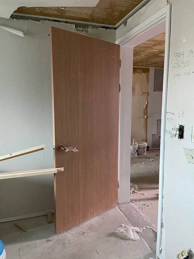 리모델링을 하다 보면 항상 변수가 생기는 것 같아요. 문틀을 떼어내고 보니 바닥 경사가 심해서 샌딩작업으로 높이를 맞춰주었어요. 집은 겉보기엔 깨끗해 보여도 막상 뜯어보면 손봐야 할 곳이 자꾸 생겨나는 것 같아요. 리모델링 예산도 변수를 생각해두고 여유있게 짜는 걸 추천드립니다.