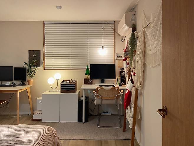 이렇게 침실 겸 작업실이 완성되었어요. 이 방에는 포근한 커튼 대신 화이트 블라인드를 달아주었는데 덕분에 이국적인 분위기도 나는 것 같아요.