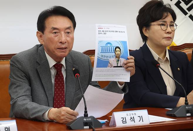 | ▲ 김석기 국민의힘 최고위원이 23일 오전 서울 여의도 국회에서 열린 최고위원회의에서 자신이 최고위원에 선출된 것을 두고 강선우 더불어민주당 대변인의 브리핑을 지적하고 있다. |