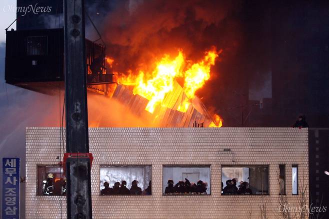 | ▲ 2009년 1월 20일 새벽 서울 용산구 신용산역 부근 재개발 지역내 5층 건물 옥상에 설치된 철거민 농성용 가건물을 경찰특공대가 강제진압 하는 과정에서 불길에 휩싸인 가건물이 무너지고 있다. |