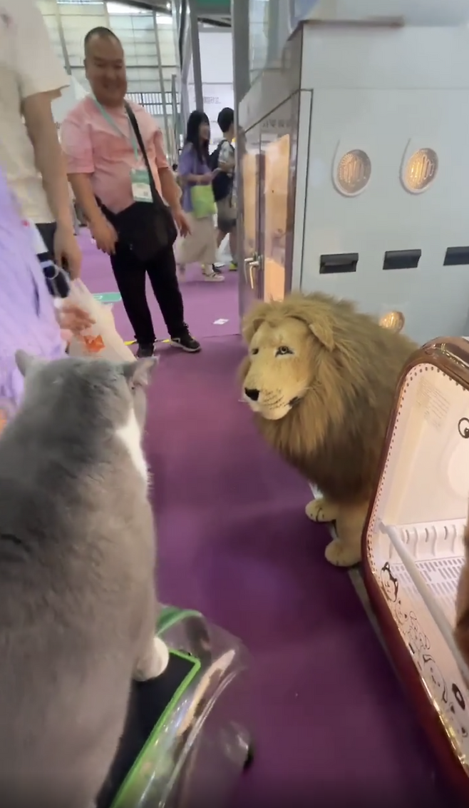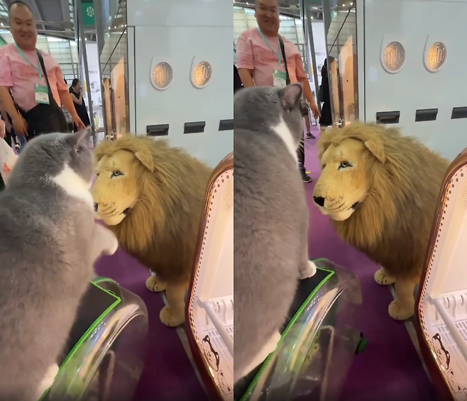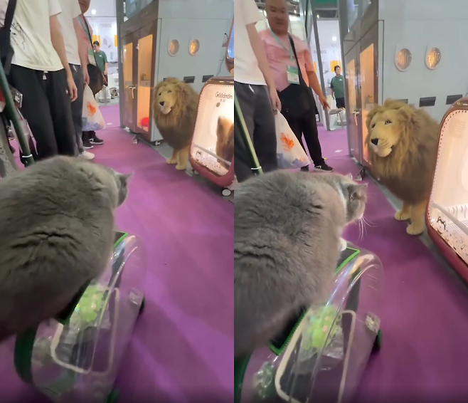 고양이의 주인은 이 귀여운 장면을 보며 웃음을 터뜨렸고, 캐리어를 끌고 가까이 다가갔습니다. 주인의 행동에 고양이는 더욱 긴장한 듯 보였고, 귀를 뒤로 제치고 사자 인형을 바라보는 눈빛에는 두려움이 가득했습니다. 마치 “이 녀석이 나를 잡아먹을지도 몰라!”라는 생각을 하는 듯 보입니다.