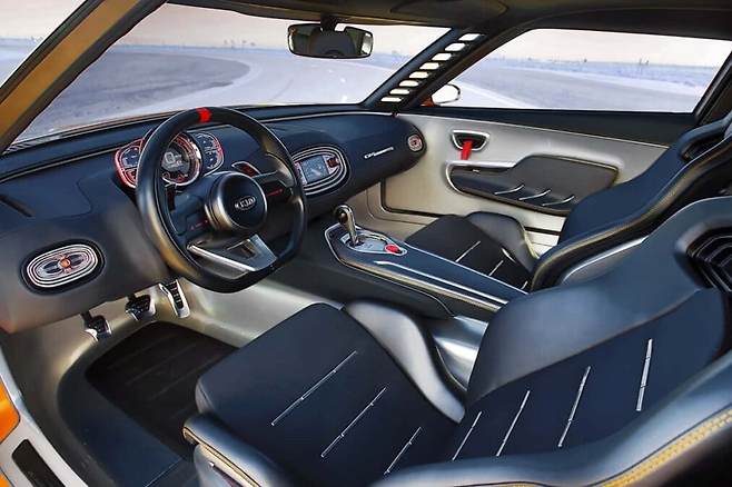 GT4 스팅어의 실내는 ‘D’ 형상의 스티어링 휠을 장착하고 있었으며, 속도계 등 주요 차량 정보가 크게 표시되어 있어 고속 주행에도 보기 쉬운 LED 계기판을 탑재했습니다. 또한, 레이싱카를 연상시키는 버킷 시트 등을 통해 기아만의 역동적이고 개성 있는 분위기를 연출했습니다. 수동이었지만 스티어링 휠 뒤에는 방향 지시등과 크루즈 컨트롤 기능을 별도로 제어하는 패들 시프터도 있었습니다.